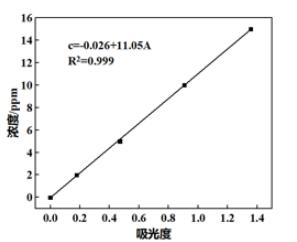 準(zhǔn)確移取磷標(biāo)準(zhǔn)儲備液0mL、2mL、5mL、10mL、15mL于50mL容量瓶中,加入釩鉬酸銨顯色劑10mL,加水稀釋至刻度,搖勻,常溫下放置10min以上,以0mL磷標(biāo)準(zhǔn)溶液為參比,用1cm比色皿在400nm波長下用i5紫外可見分光光度計測各溶液的吸光度。以磷含量為橫坐標(biāo),吸光度為縱坐標(biāo),繪制工作曲線。