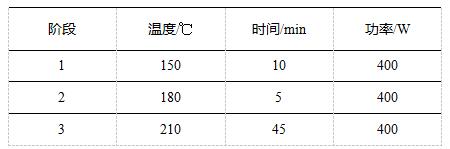 稱取剪碎的環(huán)氧墊片樣品約0.1g(精確至0.1mg),加入1mL硫酸,將消解罐放置在趕酸器上120℃預(yù)處理30min,取下冷卻后補(bǔ)加8mL硝酸和1mL氫氟酸,靜置10min左右,待無明顯反應(yīng)后,組裝消解罐,按照如下設(shè)置參數(shù)進(jìn)行實(shí)驗(yàn):