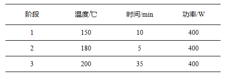 稱(chēng)取陰樹(shù)脂樣品約0.2g(精確至0.1mg),加入8mL硝酸,緩慢加入1mL過(guò)氧化氫,靜置15min左右,待無(wú)明顯反應(yīng)后,組裝消解罐,按照如下設(shè)置參數(shù)進(jìn)行實(shí)驗(yàn):